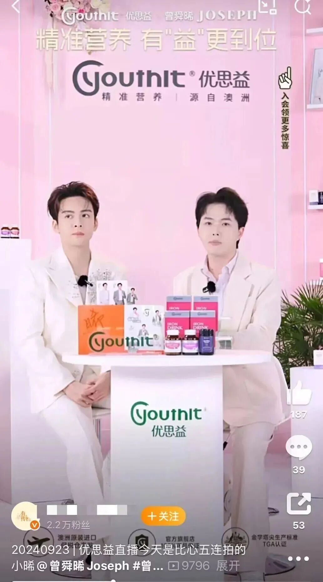 记者扫视到,李若彤、明谈、章小蕙等直播间曾实施优念念益家具,而演员曾舜晞2024年曾为优念念益常常食物代言,更在昔时6月、9月,数次出席了该家具的直播行动。