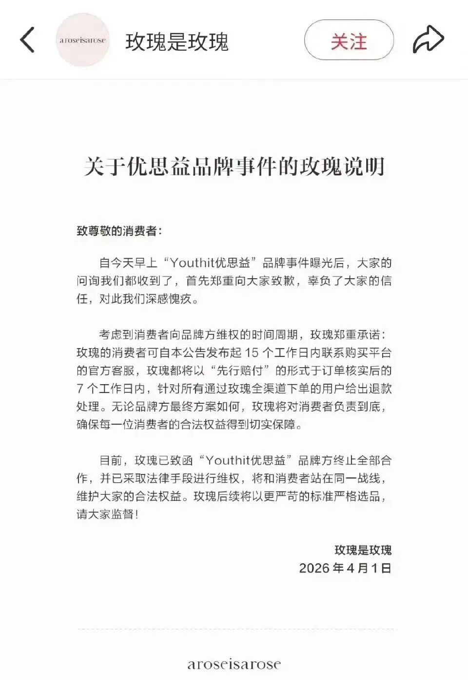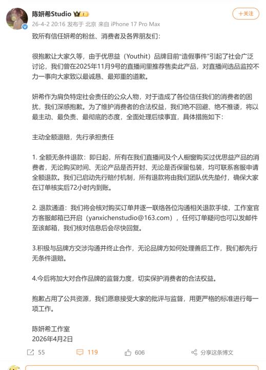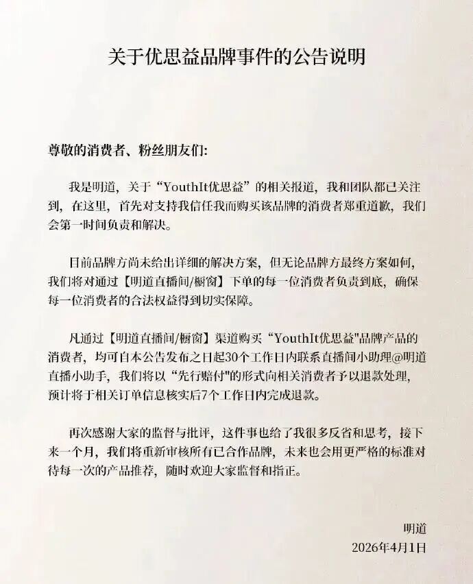 4月1日,演员明谈发布对于优念念益品牌事件的公告讲明,示意我方与团队已慈祥到对于“YouthIt优念念益”的联系报谈,“率先对复古我信任我而购买该品牌的糜掷者细心谈歉,咱们会第一时刻负责和处置。”