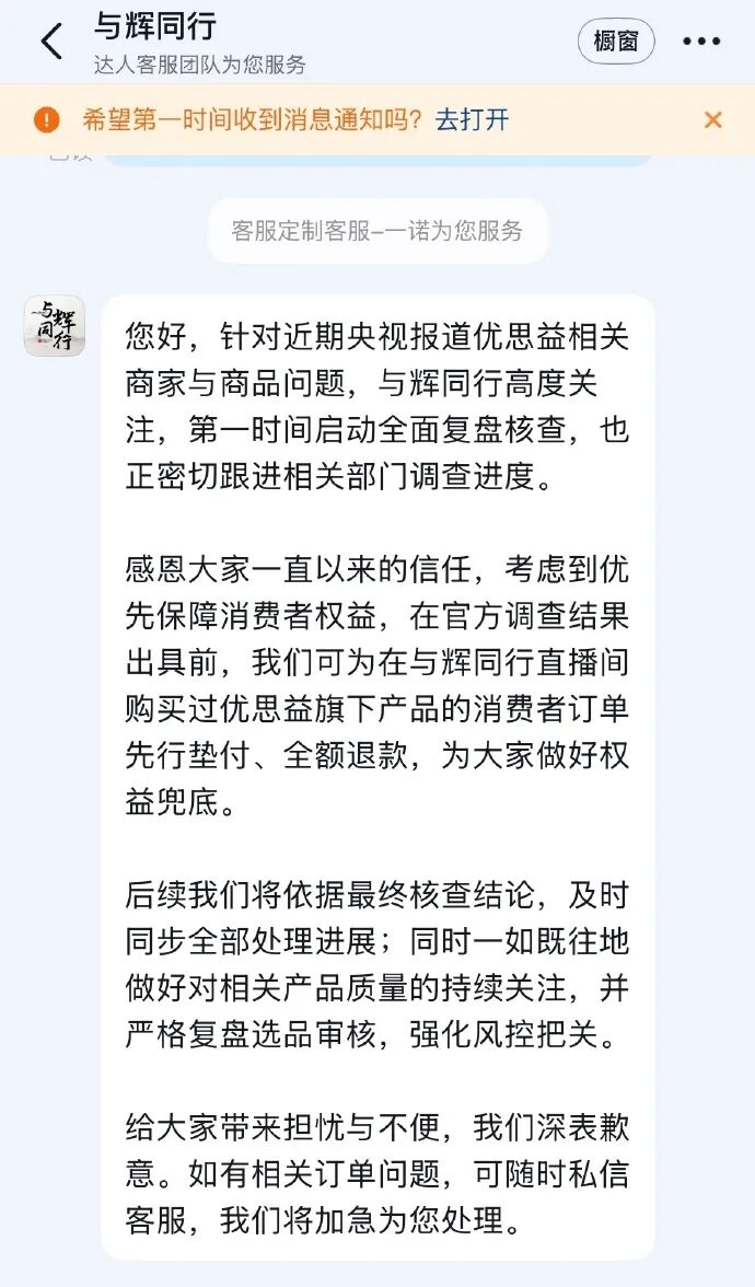 4月2日晚,头部直播间“与辉同业”回复曾带货“澳洲优念念益”: