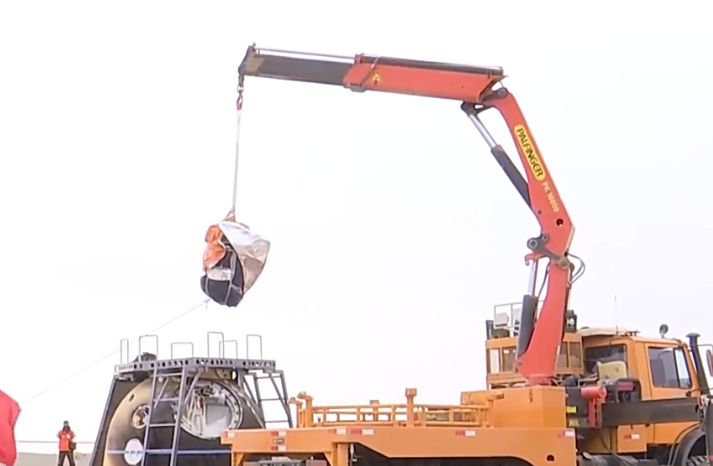航天员张陆在机械臂的配合支持下,对神舟二十号飞船返回舱舷窗进行巡检拍照。