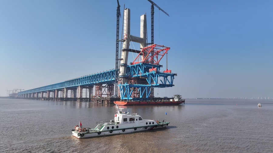 1月24日11时20分,由中铁大桥局承建的沪渝蓉高铁V标崇启公铁长江大桥主通航孔“首段”钢梁精准架设到位,这标志着这一世界最大跨度无砟轨道公铁两用斜拉桥主通航孔吊装作业正式拉开帷幕,预计于今年5月底完成主通航孔吊装作业,大桥实现合龙。这一关键节点的顺利启幕,标志着国家“八纵八横”沿江高铁通道控制性工程迈入关键冲刺阶段。