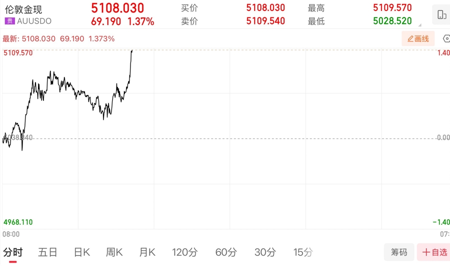 现货黄金首次突破每盎司5100美元大关。