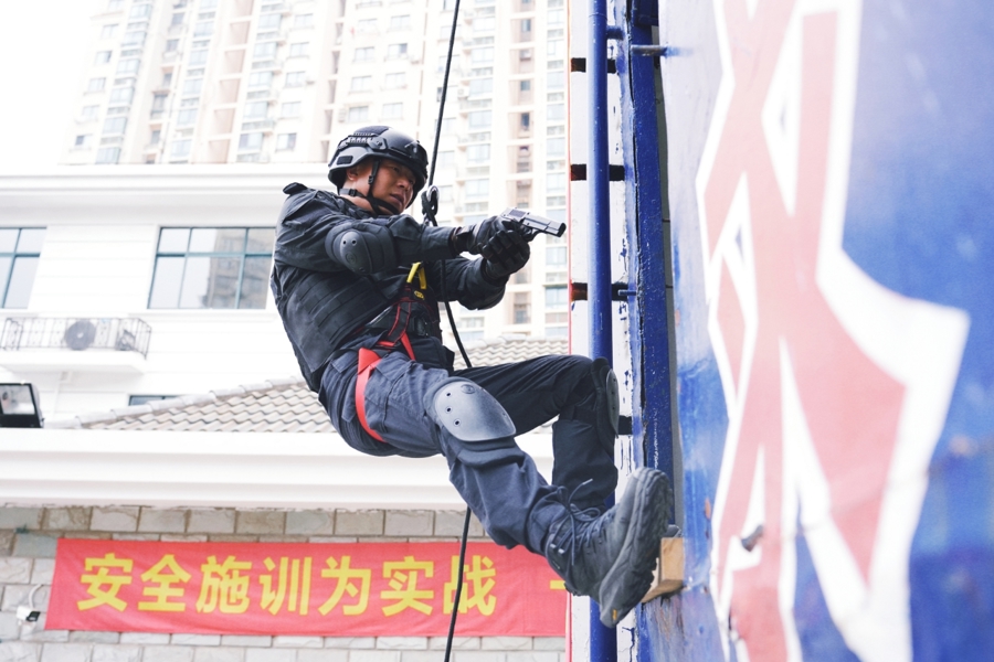 “嘶——”绳子与手套摩擦的声响从六层楼高的西宾塔顶传来,敏锐而急忙。塔顶,别称“严德海突击队”的特警队员身体后仰,沿着墙面疾速下滑。两秒,一秒——接近大地的一霎,他右手猛地捏紧绳子,制动落地,膝盖微曲卸掉冲击力,整套动作干净利落。“制动时代还不错再晚少许!”一旁的教官细致纪录,提议建议。塔顶上,下别称队员也曾扣好绳子,恭候起程领导。这是杨浦公本分局特警支队在“砺兵杨浦2026”行径中的练兵一幕。将实战的设施镶嵌到每一场西宾中,从体能得手段,从传统计谋西宾到新质战力进步,杨浦特警的练兵一切向实战看王人。