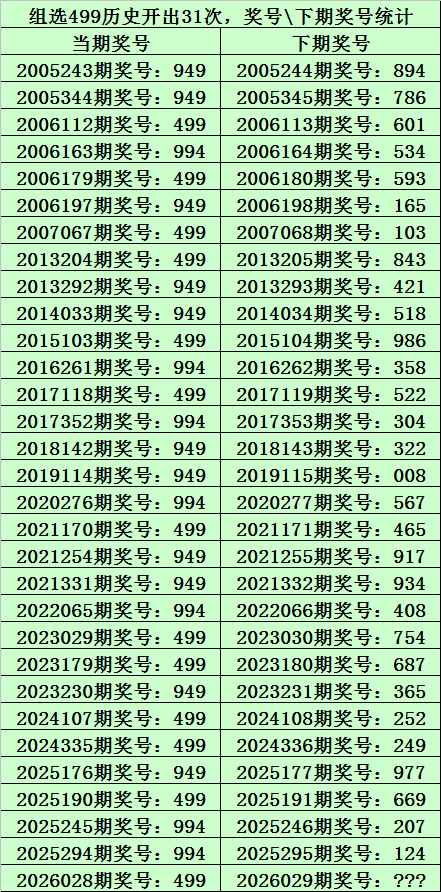 上期回顾:排列三第2026028期奖号为:499,类型:组三,历史上直选号码499出现了13次,组选号码499出现了31次。